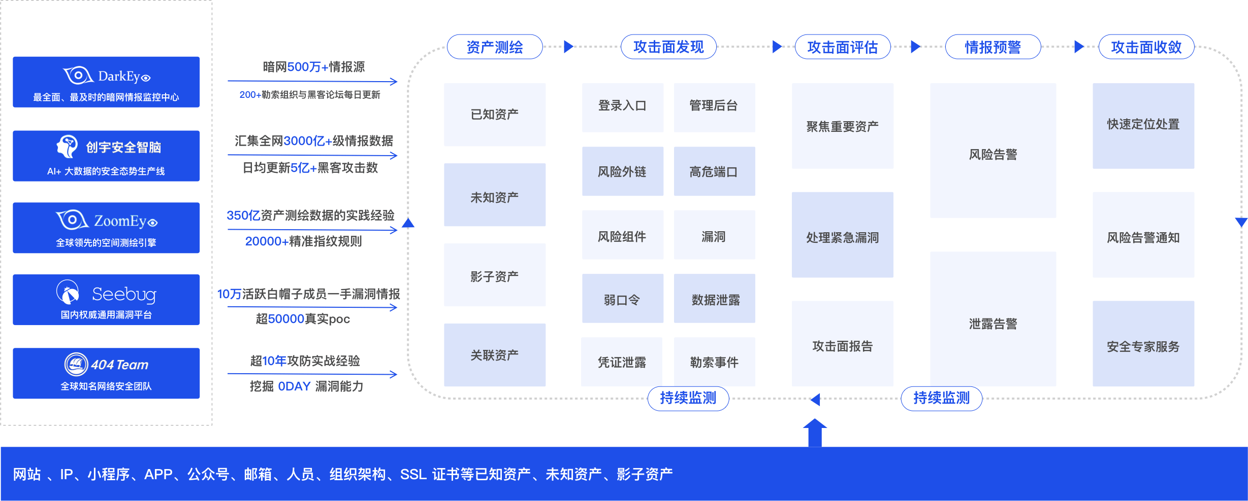 深度感知互联网资产安全风险,分钟级掌握攻击面,提供Web漏洞、主机漏洞、暗链、挖矿、风险外链、违规内容等风险监测能力,并结合创宇安全智脑情报能力,不断感知外部攻击环境变化,及时发现资产弱点风险,获取资产全量风险态势。
